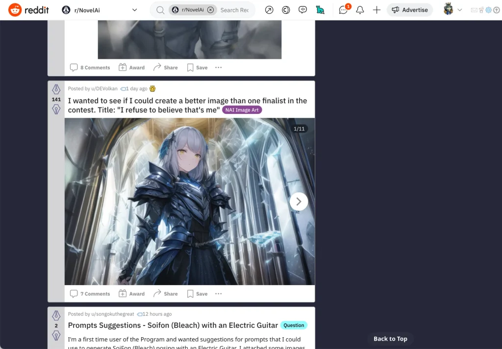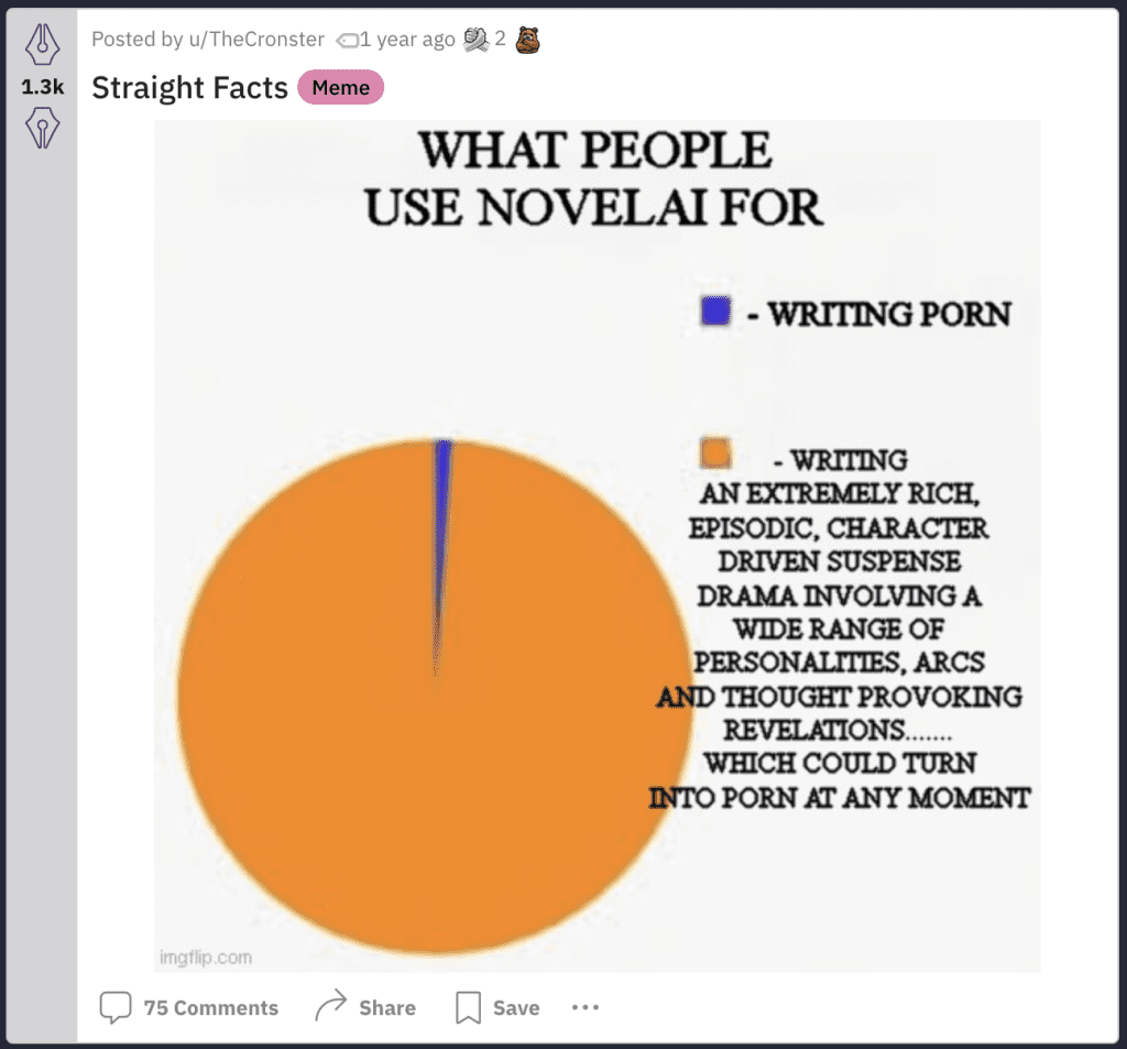 NovelAI started as an AI story writer. In October 2022 they released an anime image generator, which was hugely popular. Now most of the top posts on the sub are anime images.