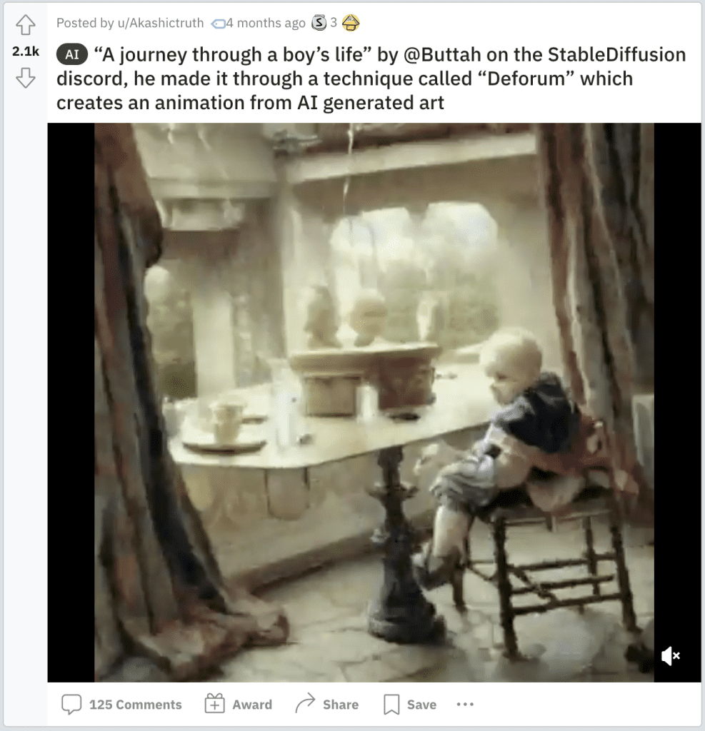 Top Post of All Time: “A journey through a boy’s life” by @Buttah on the StableDiffusion discord, he made it through a technique called “Deforum” which creates an animation from AI generated art