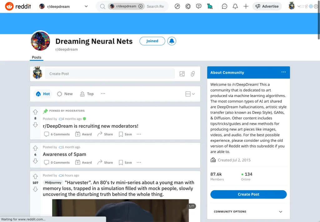 An older community that was created in 2015. Since it features many types of AI art, the images appear more surreal and otherworldly than those posted on other subreddits.