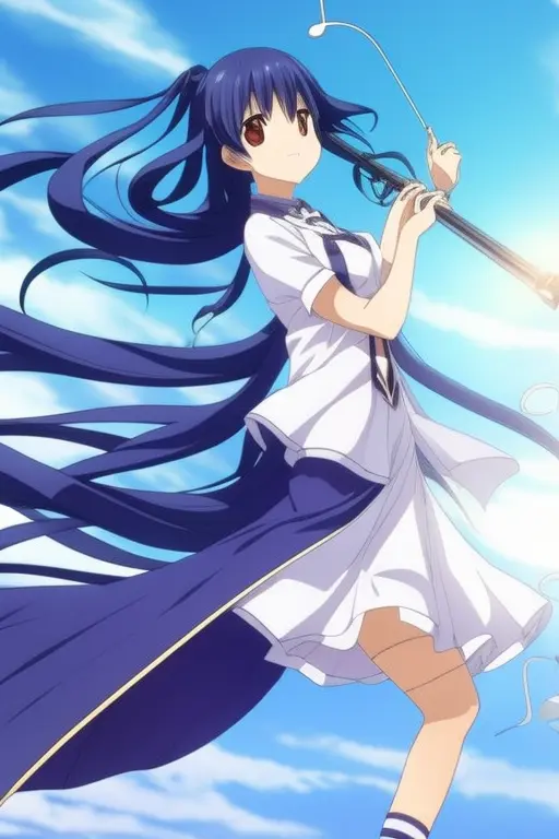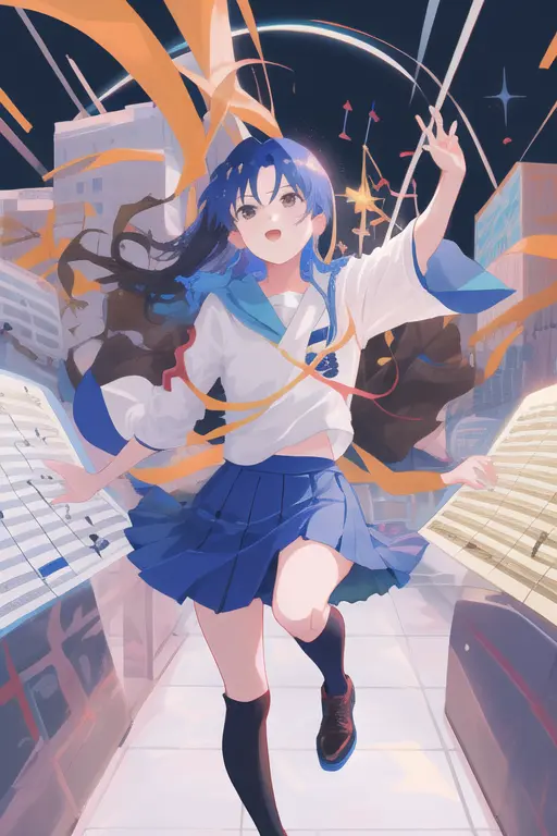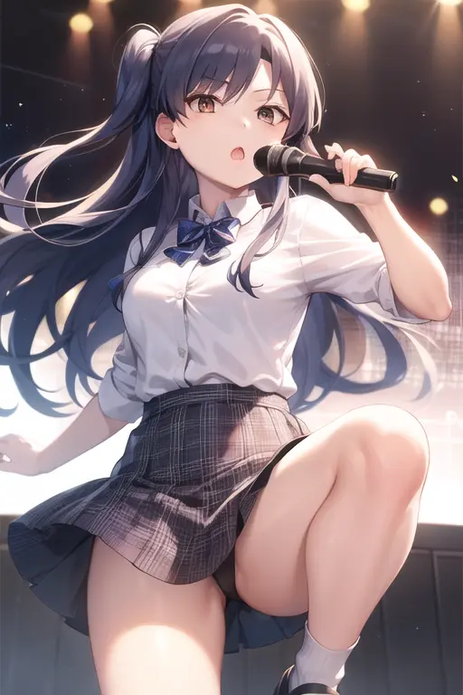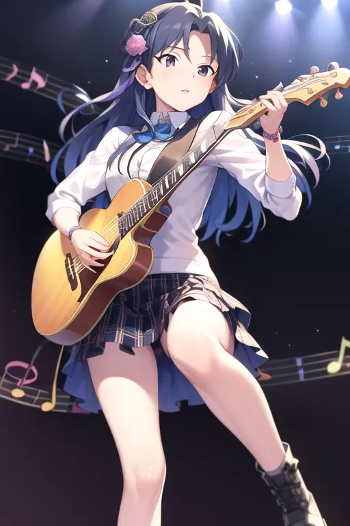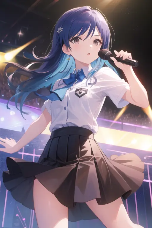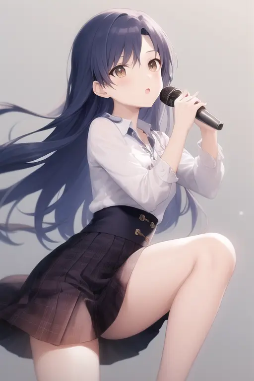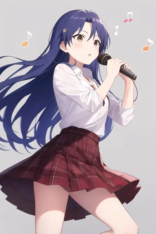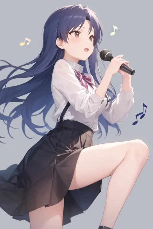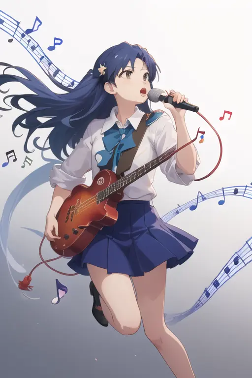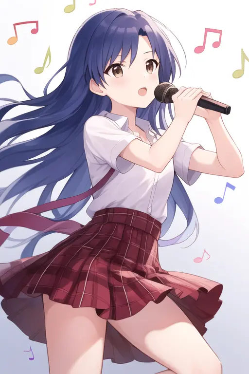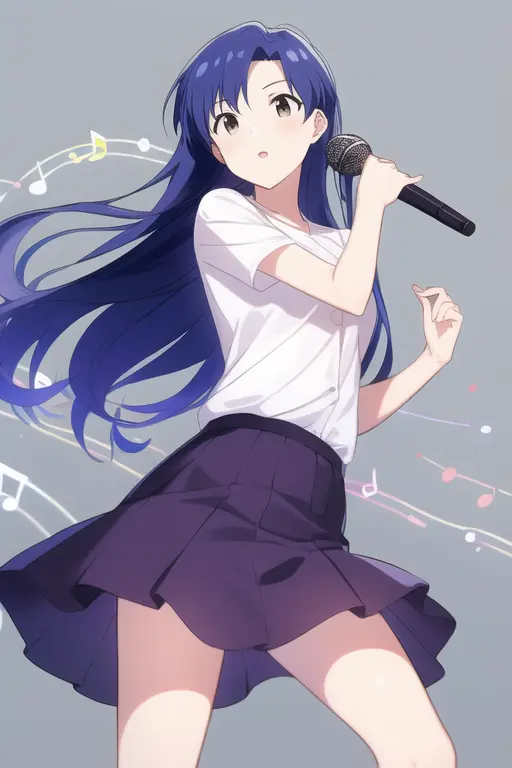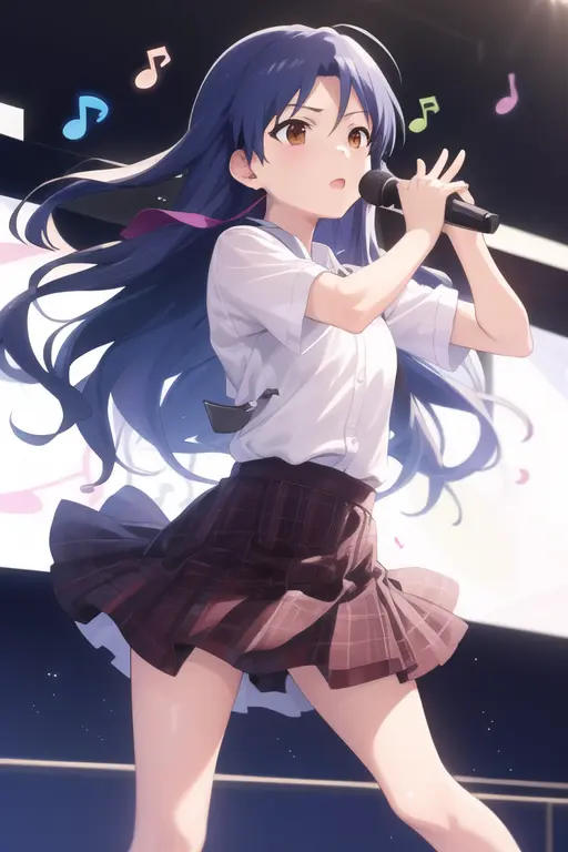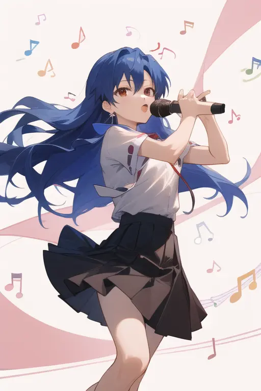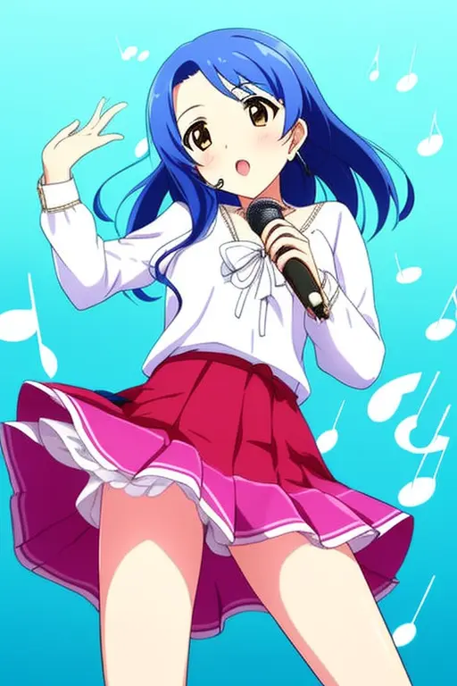 masterpiece, best quality, kisaragi chihaya, solo, 1girl, ((musical notation)) vector background:0.2], anime, idolmaster, singing, long blue hair, brown eyes, idol, knee length skirt,white shirtNegative prompt: