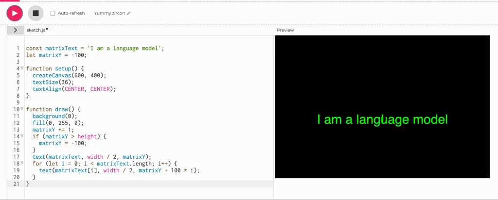 This code creates a canvas with a size of 600x400 pixels, and draws a scrolling green text with the message "I am a language model". It also centers the text horizontally and animates it to move upwards on the canvas.