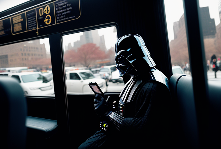 darth vader sitting on bus looking at his phone wearing black gloves, new york city passing by outside