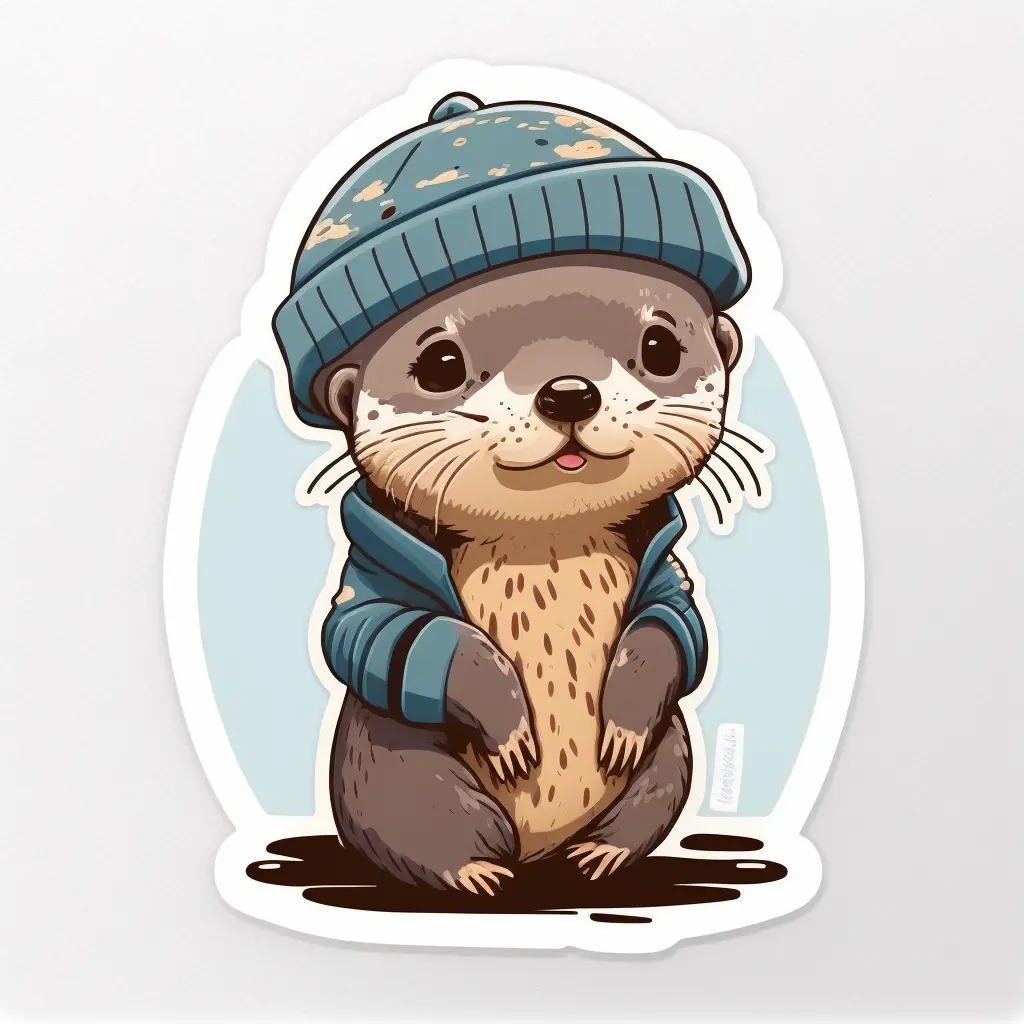 sticker design, super cute baby pixar style otter , wearing a beanie, vector