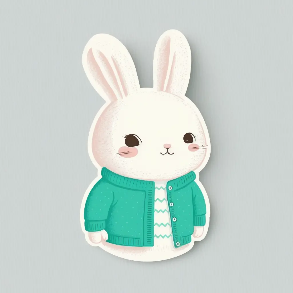 sticker design, super cute baby pixar style white rabbit, wearing a cyan sweater, vector