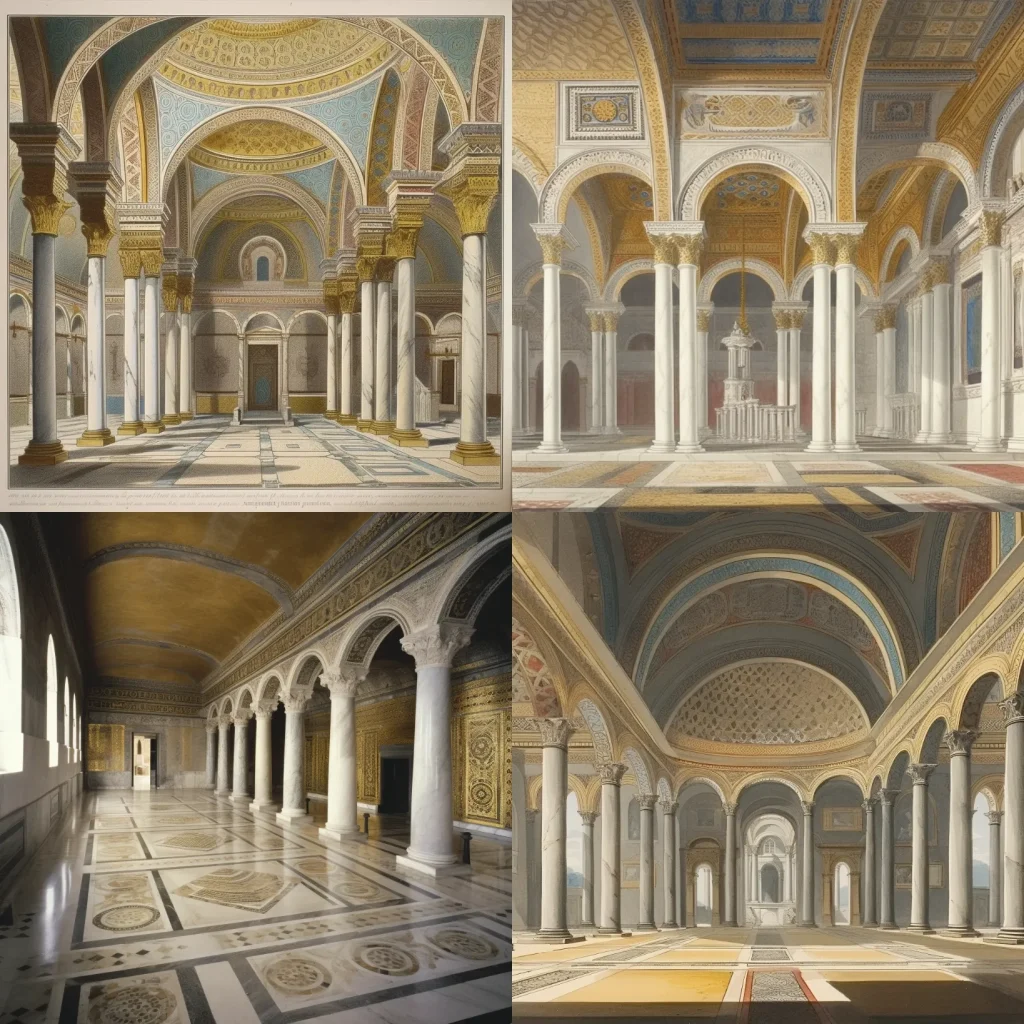 Byzantine Architectural Design, landscape view, marble columns and inlay, mosaics on the vaults, inlaid-stone pavements, gold coffered ceilings, highly stylised, flattened designs --v 5
