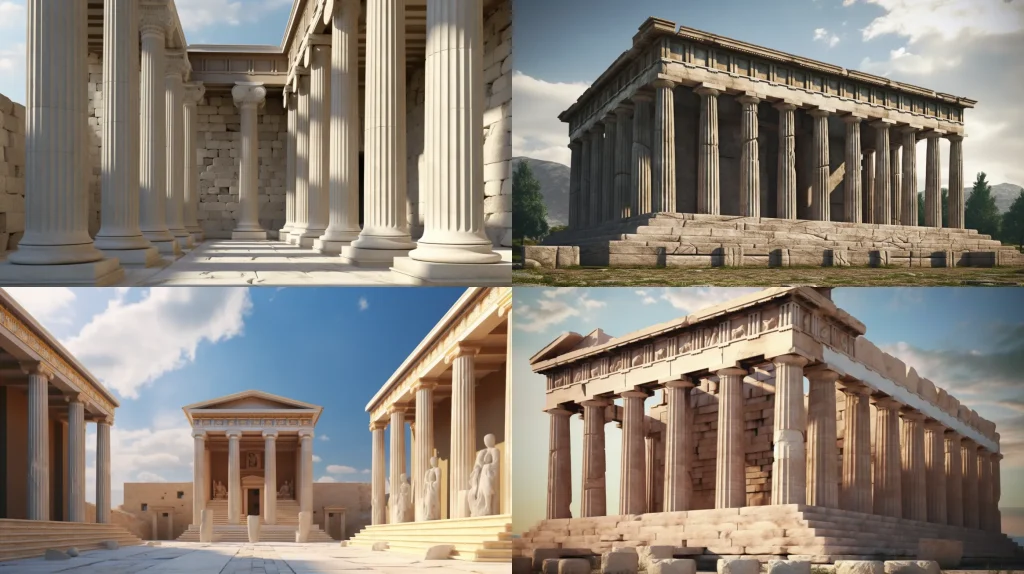 Ancient Greek Architectural Design, landscape view, tall columns, intricate detail, symmetry, harmony, substantially intact temples, open-air design, --ar 16:9 --v 5
