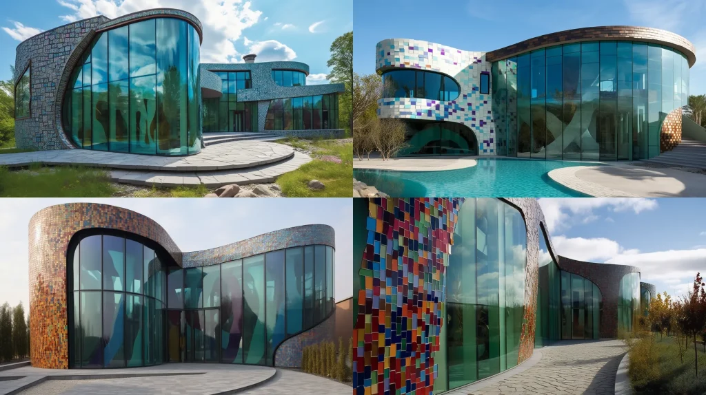 post modern Architectural Design, landscape view, curved forms, decorative elements, asymmetry, dark green colored glass, ceramic tiles, stoned tiles, --ar 16:9 --v 5