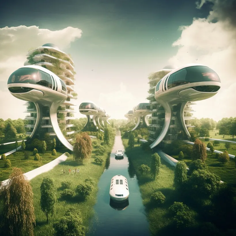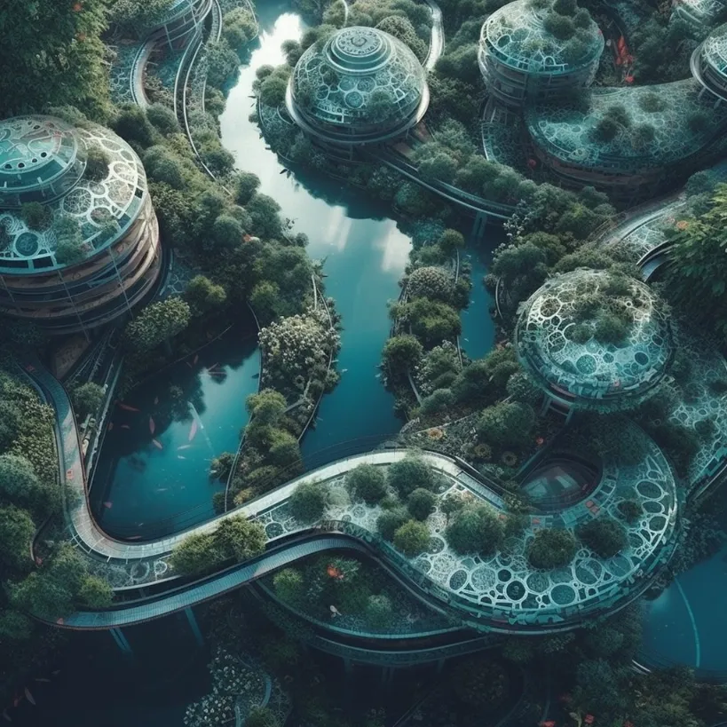 futuristic architecture, central pod in the middle connected by futuristic monorail transportation to identical smaller pod houses around in a circle surrounding the main pod, ultra-realistic photograph, high-tech architecture, community living, surrounded by water and green nature, high level view, renewable energy spaces --v 5