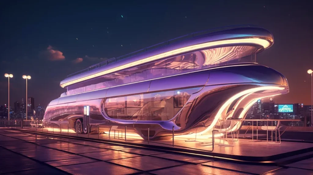 street style photography, the architecture of the future of motor homes against a futuristic golden track highway background, swimming pool and sun deck on the roof, retractable wings, stained glass windshield, glowing neon hub caps --ar 16:9 --v 5