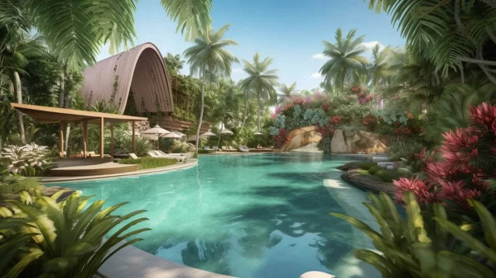 A luxurious resort of the future with a stunning Olympic-size swimming pool, surrounded by lush greenery and exotic flowers