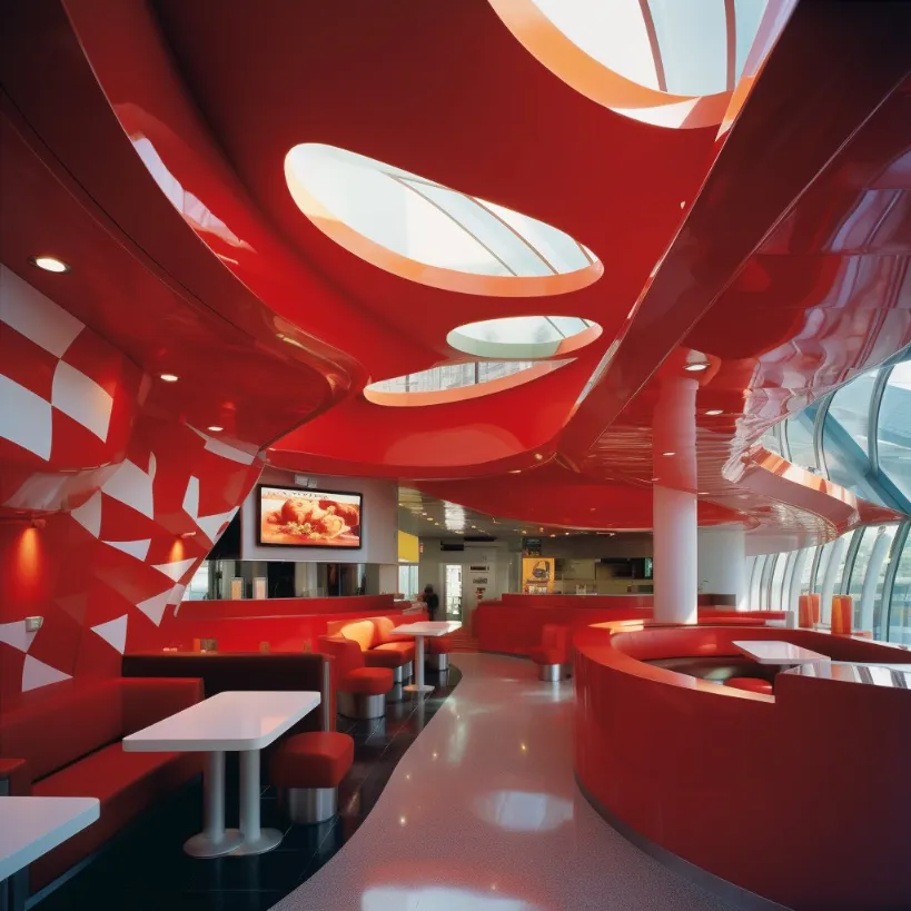 futuristic architecture, McDonald’s, interior design, futurism, futuristic, happy meal --v 5