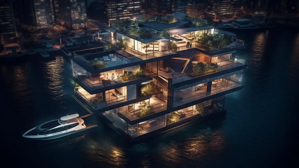 Sci-fi, eye-catching Birds eye view, perspective of a scene from above, futuristic, sleek, modern, floating townlet, at night, ultrarealistic, photographic, sharp focus --s 500 --ar 16:9 --v 5 --c 10