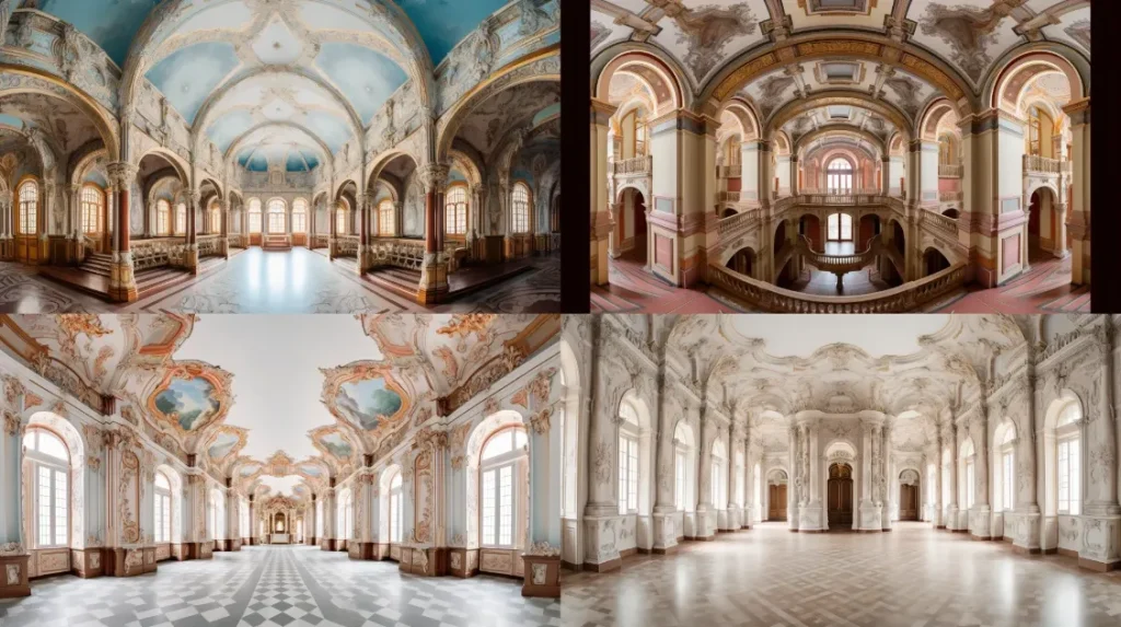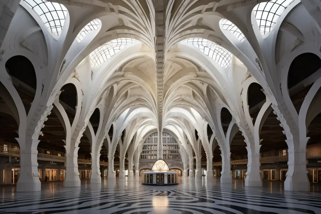 Captivating grand interior, a vast architectural space, photography by Candida Höfer, symmetry, color, and intricate details, --ar 16:9 --s 50