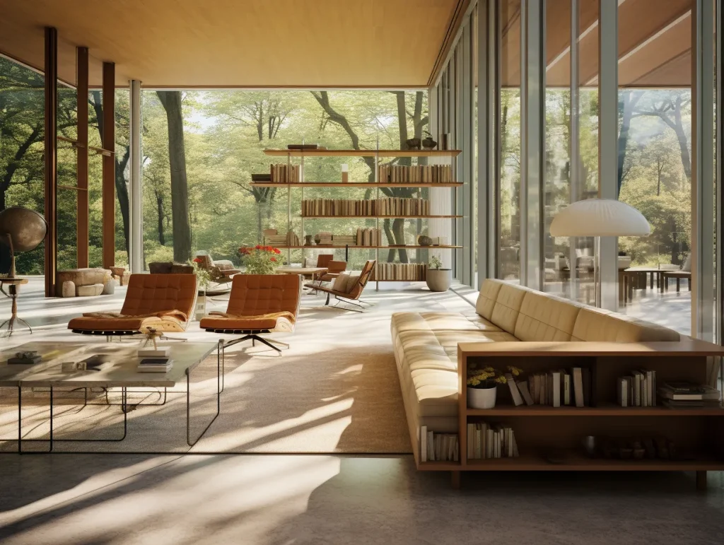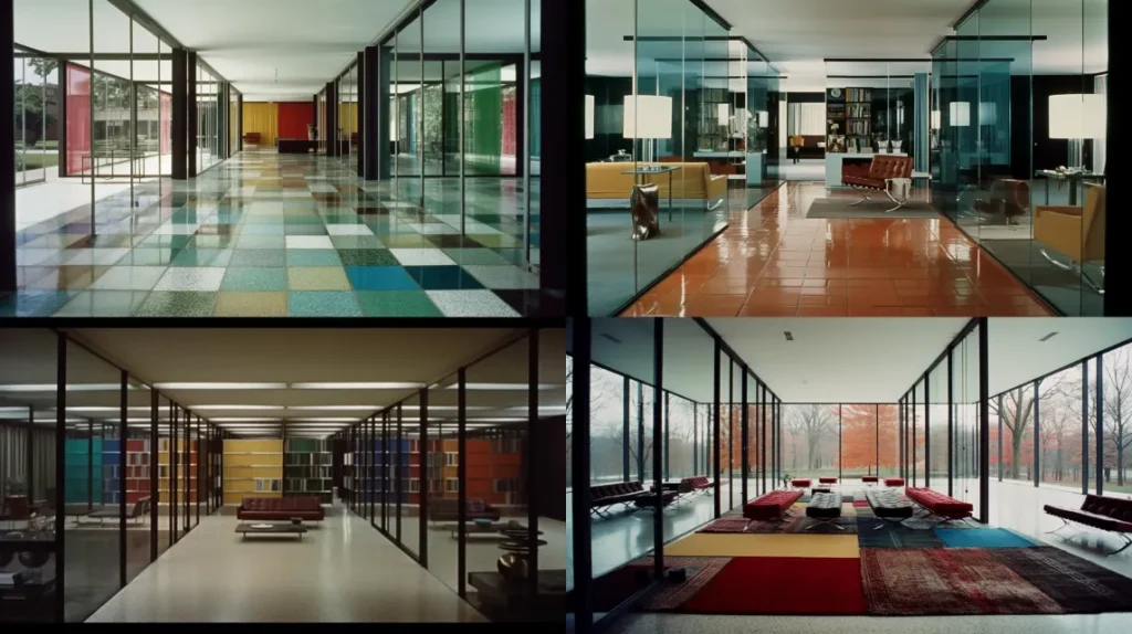 Interior by Ludwig Mies van der Rohe, house with glass and mirrors and grid columns, a fractal structured floor plan, photographed by Ezra Stoller, color photography --ar 16:9 --c 2 --s 90
