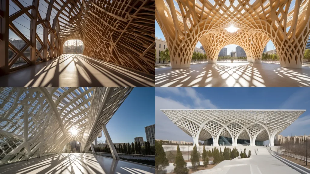 Intricate lattice framework, a contemporary cultural center, sun shining through, designed by Santiago Calatrava, photo by Iwan Baan --ar 16:9 --c 1 --s 90