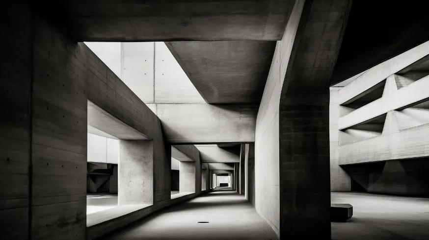Minimalist concrete structure with geometric forms and dramatic shadows, inspired by awe, Brutalist style, Le Corbusier, photographed by Ezra Stoller --ar 16:9 --c 2
