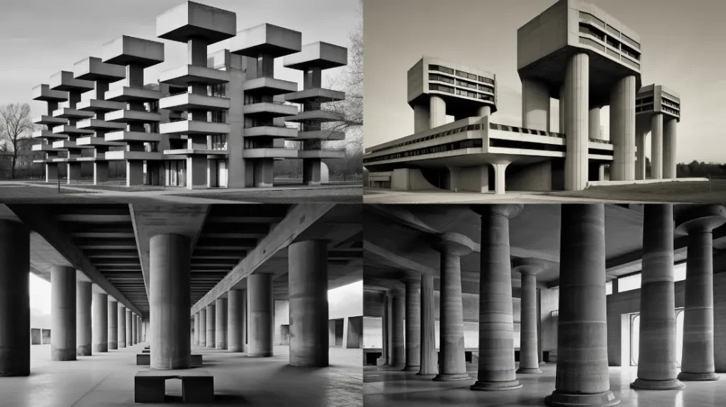 axial progression, reminiscent of hellenic columns but brutalist, sublime and worthy of awe, Brutalist style, Le Corbusier, photographed by Hélène Binet --ar 16:9 --c 2