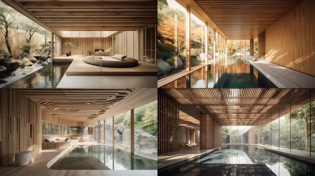 large interior by Kengo Kuma, Harmonious blend of natural elements and modern design, an eco-friendly structure, pools and falling water --ar 16:9 --c 1