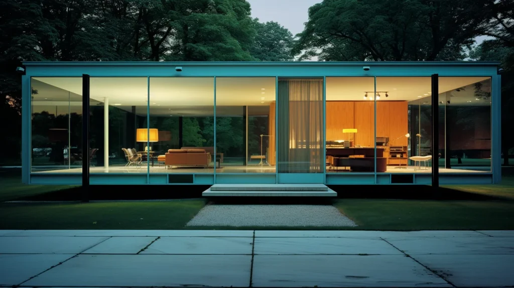 Ludwig Mies van der Rohe, house with glass and mirrors and grid columns, light and modern and transcendent, photographed by Ezra Stoller, color photography --ar 16:9 --c 2 --s 90