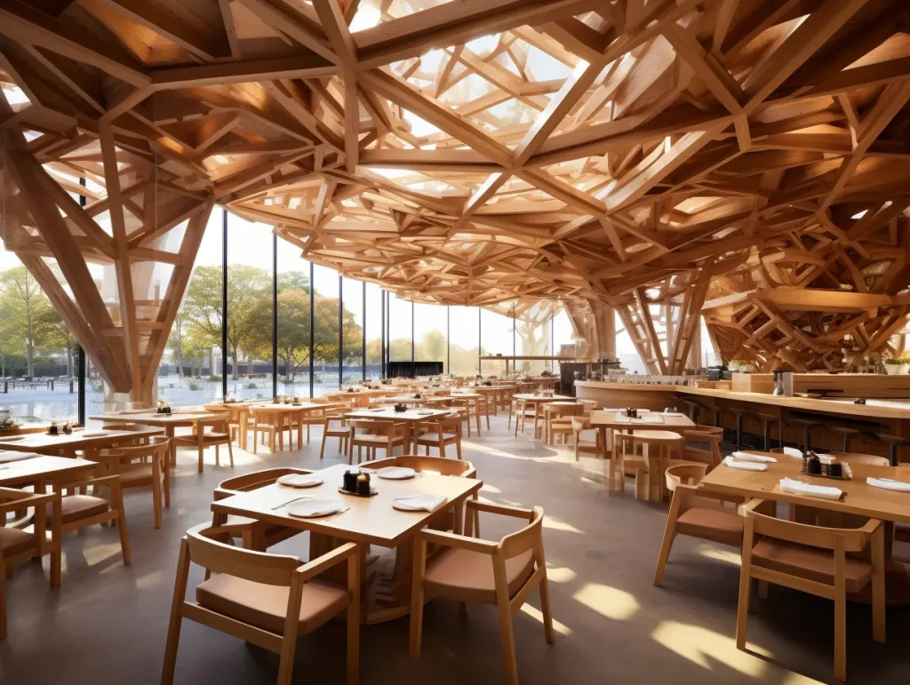 design by kengo kuma, a restaurant has wood trusses as the dining table, in the style of pixelated landscapes, piles/stacks, sōsaku hanga, 32k uhd, hyper-detailed, kanō school, texture --ar 4:3 Convert