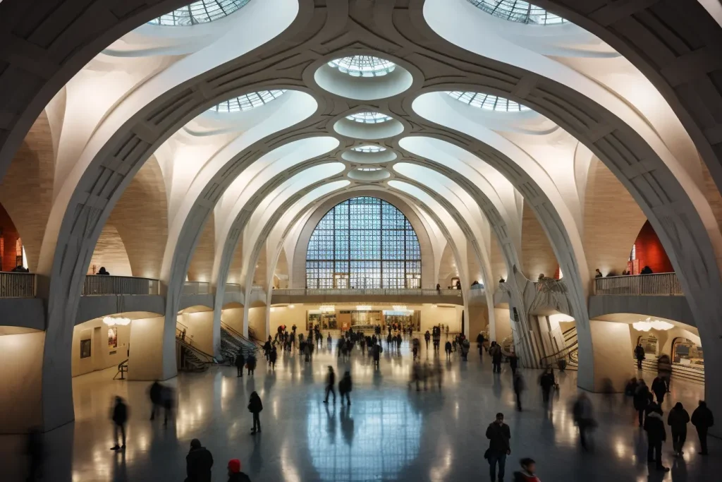 the entrance to grand central harlem station is a white, winding shape, in the style of santiago calvatrava, birds-eye-view, floating structures, extravagant table settings, striped, post processing, composite construction --ar 3:2