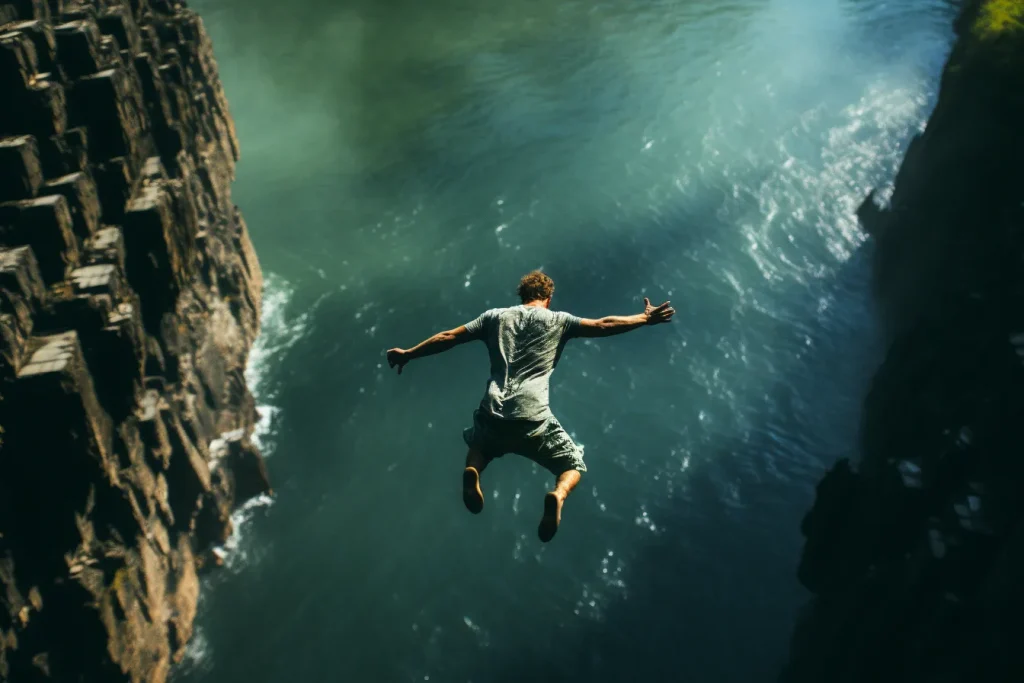 A bird-eye shot photo of a man jumping at the cliff of waterfalls, shot on Lomography Color Negative 800 --v 5.2 --ar 3:2