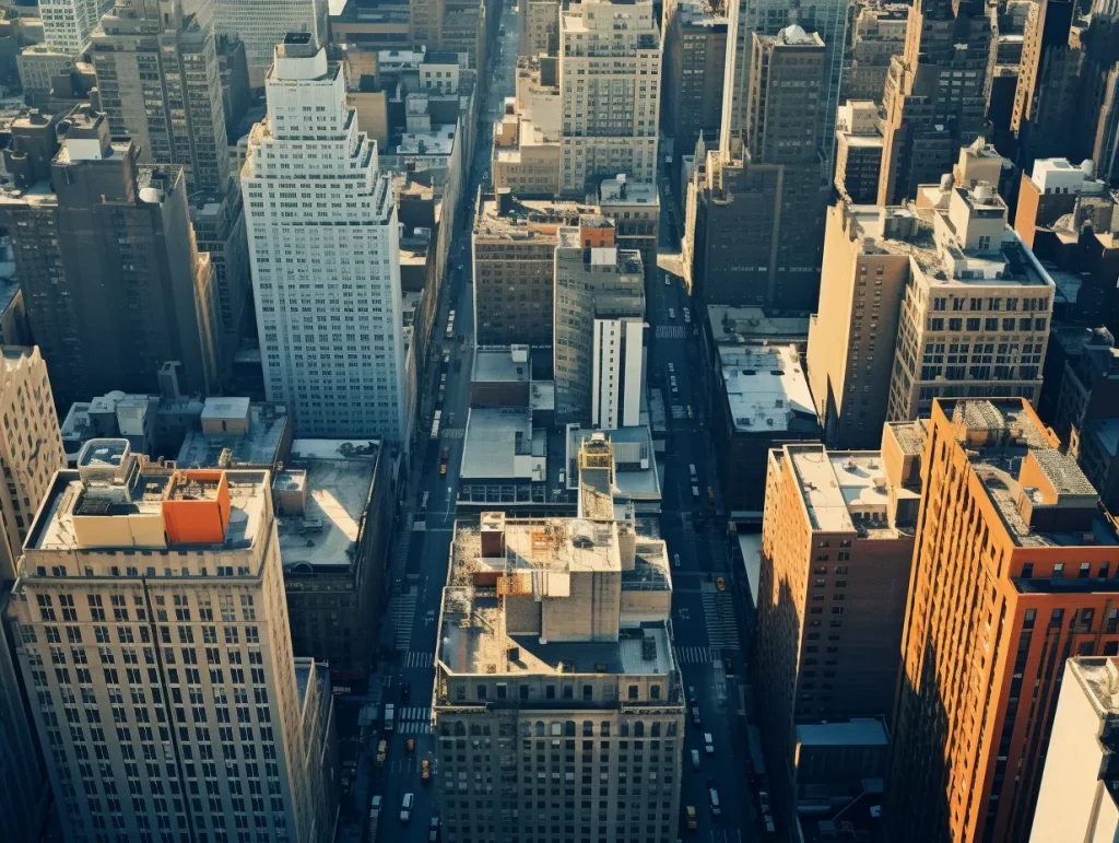 A bird-eye shot photograph of New York City, shot on Lomography Color Negative 800 --v 5.2 --ar 4:3