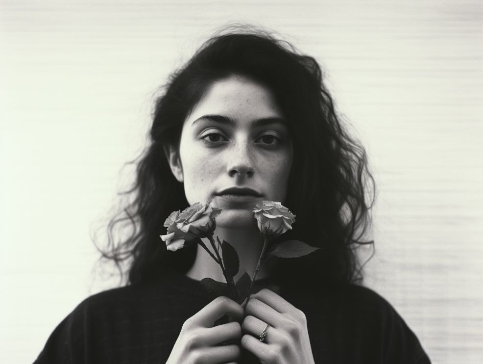 An upper body portrait of a beautiful 28 year old woman, holding a flower, Award-winning photography, Shot on Tri X --ar 4:3 --v 5.2