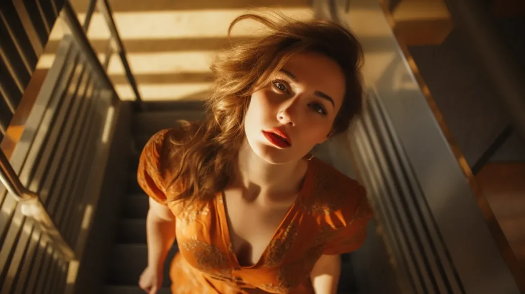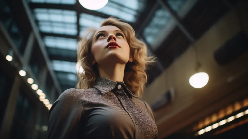Retro style low-angle photo from below of a woman, shot on Fujifilm Pro 400H --v 5.2 --ar 16:9