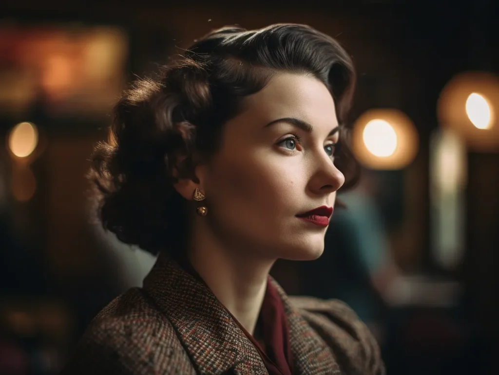 Retro style side-angle view photo of a woman, shot on Fujifilm Pro 400H --v 5 --ar 4:3