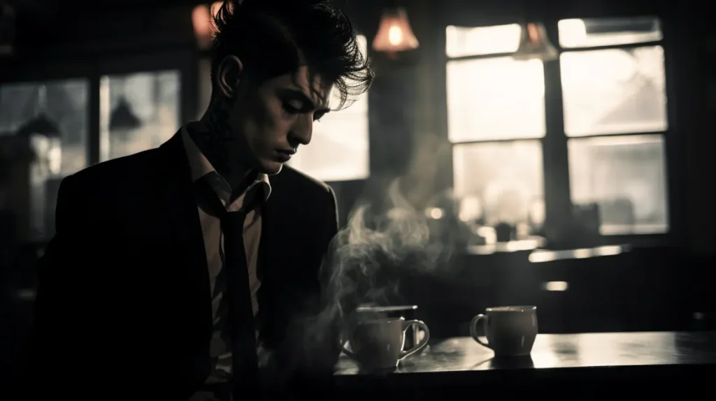 Side angle of a 20 year old yakuza at coffee shop, shot on Afga Vista 400, diffused lighting --v 5.2