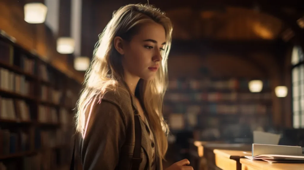 Side angle shot of a 20 year old girl in library, shot on Afga Vista 400, rim lighting --v 5.2 --ar 16:9