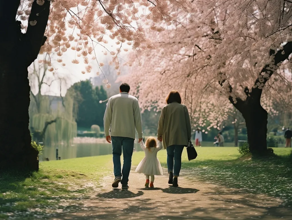 back view of a mother, father and, a baby in the middle walking at the park full of cherry blossom, shot on Lomography Color Negative 800 --ar 4:3 --v 5.2