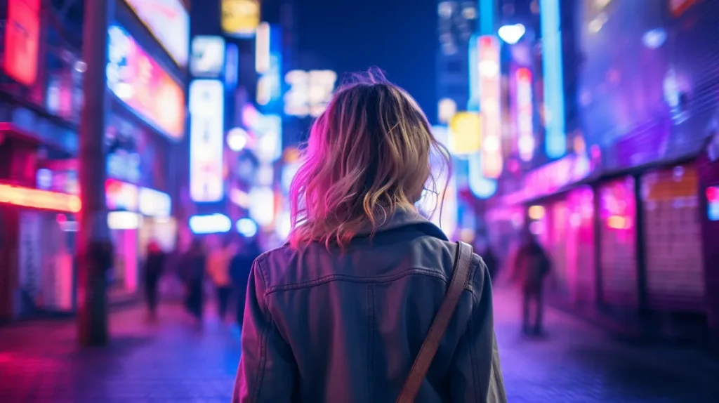 back view of a woman walking at Shibuya Tokyo, shot on Afga Vista 400, night with neon side lighting --v 5.2 --ar 16:9