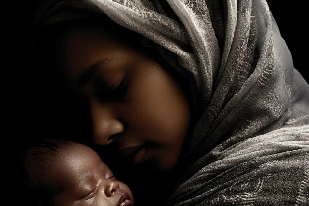 closeup shot of a newborn baby carried by the mother, natural lighting, shot on Kodak Gold 200, shot by Yousuf Karsh --v 5.2 --ar 4:3