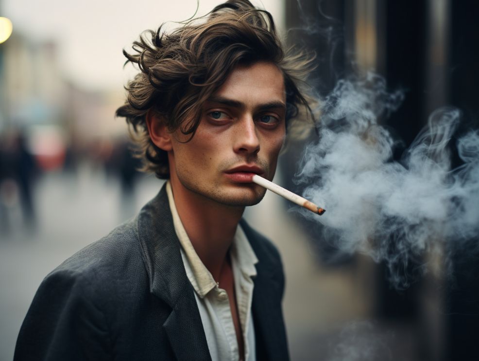 closeup shot of street-style man smoking cigarette, shot by Annie Leibovitz --v 5.2 --ar 4:3