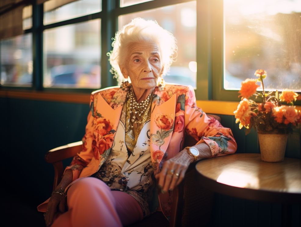 elderly women wearing a floral patterned blazer sitting in cafe, golden hour lighting --ar 4:3 --v 5.2
