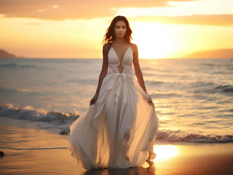 full body prenup shot of a woman beside the beach wearing white gown, afga vista 400, sunset --v 5.2 --ar 4:3