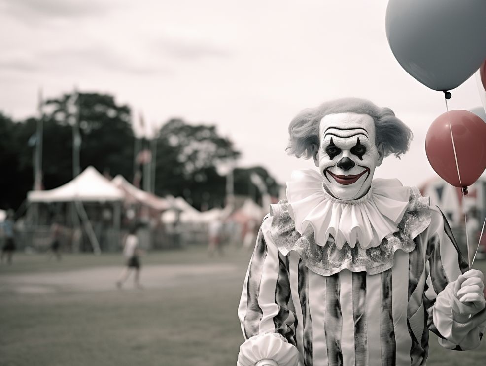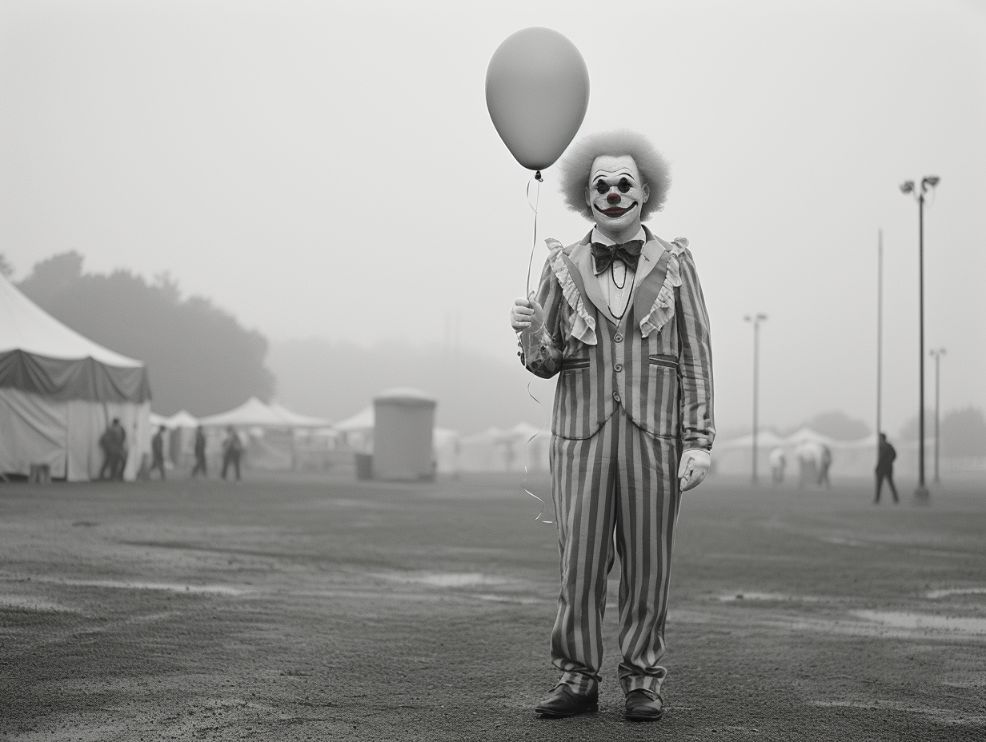 medium shot of a clown holding a balloon at a carnival park, shot on Fujifilm Neopan Across 100 --v 5.2 --ar 4:3