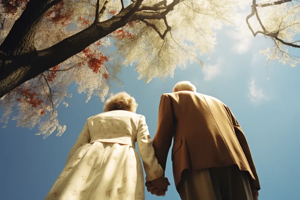 low-angle photo from below of an old couple holding hands at Park, Kodak Ektachrome E100 --v 5.2 --ar 3:2