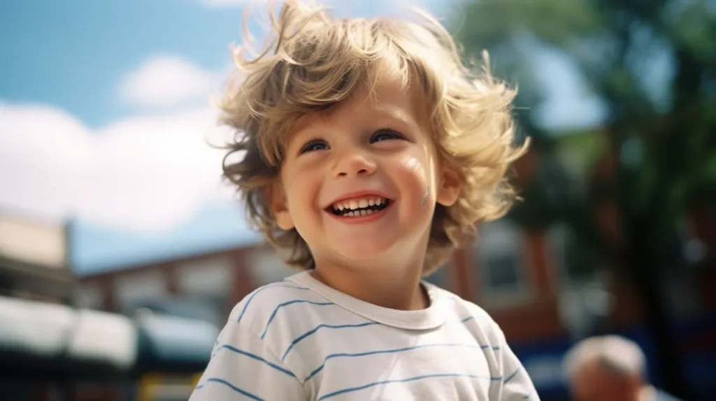 low-angle view of a smiling 2-year-old boy. Kodak Ektachrome E100 --v 5.2