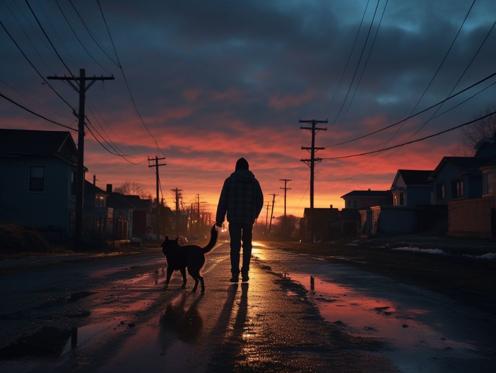 man walking dog at dusk --ar 4:3 --v 5.2
