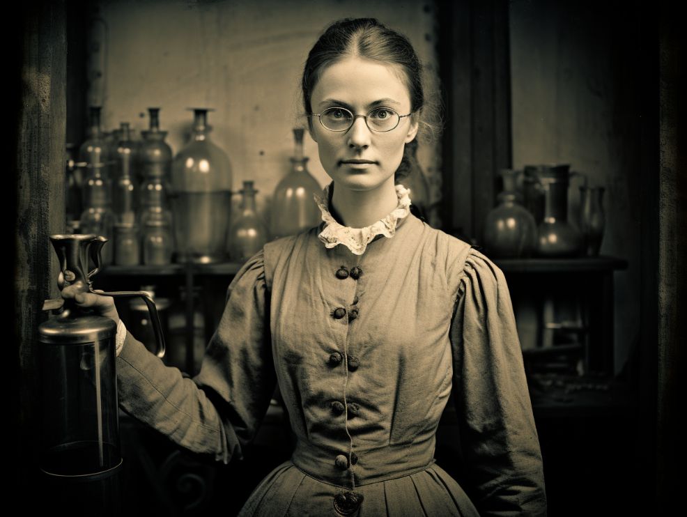 photo of a 19th century scientist woman that invented a something liquid chemical in laboratory lab, she is wearing a protective glasses and lab gown, shot on Daguerreotype plate --ar 4:3 --v 5.2