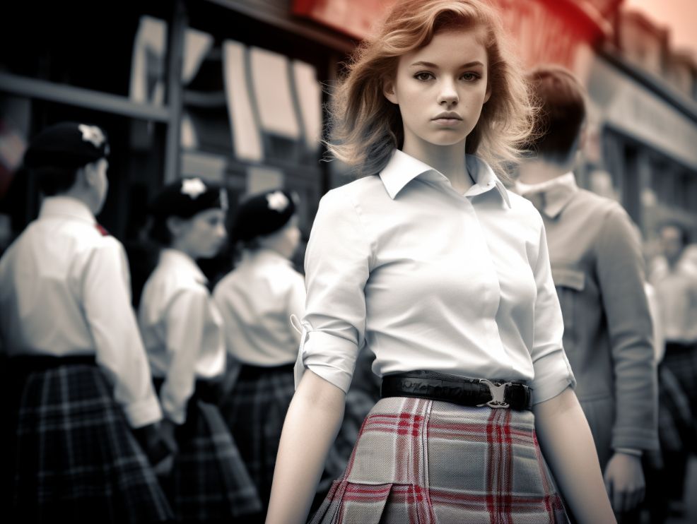 street style image of a young model with school uniformed, short skirt, waiting patiently in a parade, shot on infrared 750 --ar 4:3 --v 5.2