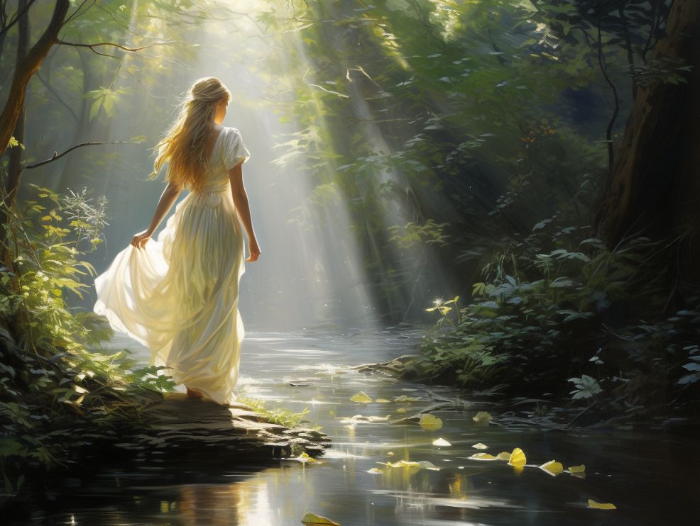 woman in white gown walking through forest:: sunlight streaming::1.5 --ar 4:3