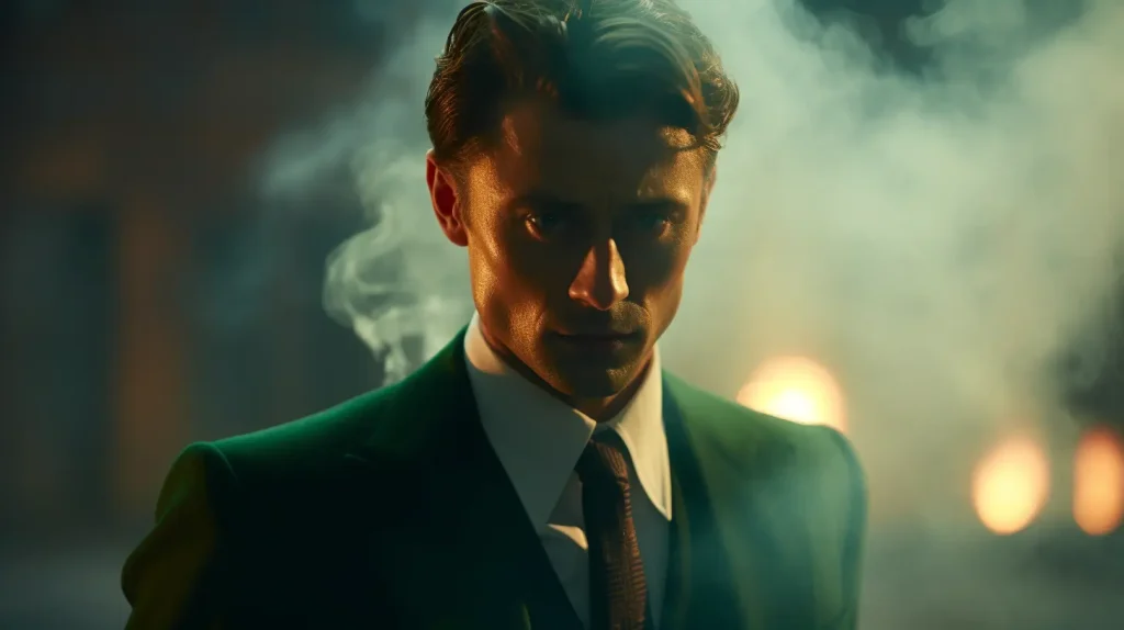 a man in a brown blazer standing in front of smoke, backlit, in the style of gritty hollywood glamour, light brown and emerald, movie still, emphasis on facial expression, robert bevan, violent, dappled --ar 16:9