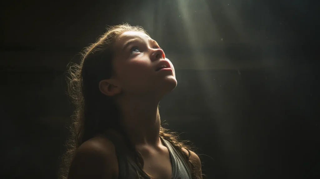 girl looking up, nostalic and hazy, rim lighting, dark composition --ar 16:9