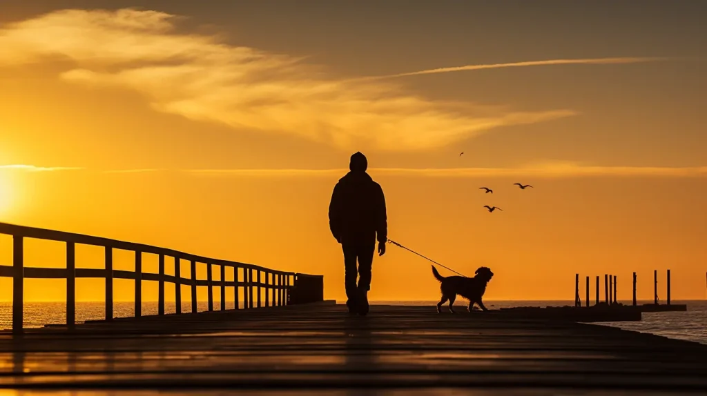 golden hour, silhouette of a man walking his dog on the pier --ar 16:9