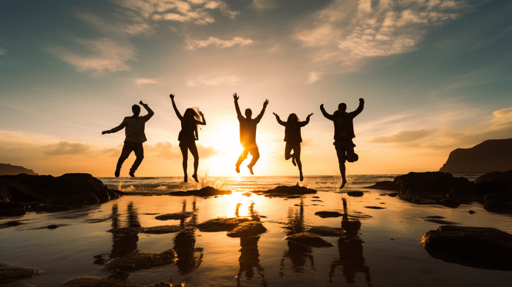 golden hour, silhouette of friends jumping up on the beach for a photograph --ar 16:9