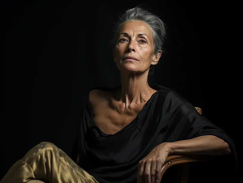 photo portrait of a woman sitting, studio portaiture, john lurie, sony alpha a1, studio portrait, performance --ar 4:3